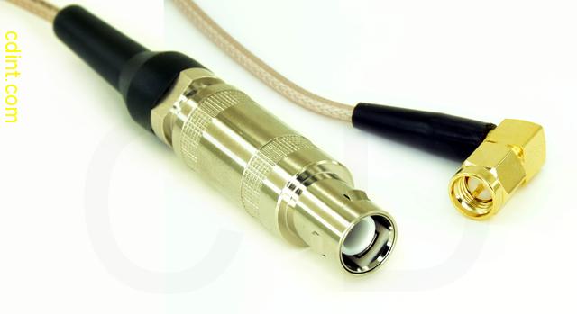 L1SA9-316-8 is a RG316 8 foot 50 ohm (2.44 meter) coax cable assembly with a L1 (Lemo 1 compatible) connector on one end and a SMA 90 degree (right angle) connector on the other end.